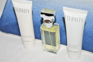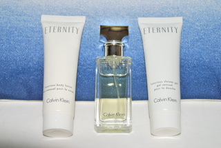 Brand New Calvin Klein Eternity Gift Set, includes .05 OZ. Eternity Women's Spray Purse Size Perfume, 1 OZ. Luxurious Eternity Body Lotion and 1 OZ.Eternity Luxurious Shower Gel in a beautiful Calvin Klein Travel Bag. Free Shipping.