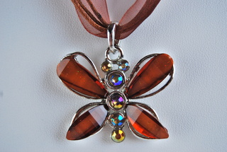 Ladies Designer Amber & Crystal Butterfly Design Necklace on Ribbon Cord.