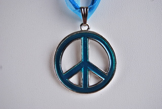Ladies Designer Blue Peace Sign Design Necklace on Blue Ribbon Rope Cord.