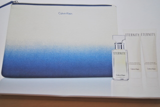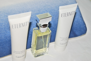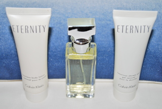 Brand New Calvin Klein Eternity Gift Set, includes .05 OZ. Eternity Women's Spray Purse Size Perfume, 1 OZ. Luxurious Eternity Body Lotion and 1 OZ.Eternity Luxurious Shower Gel in a beautiful Calvin Klein Travel Bag. Free Shipping.