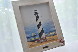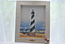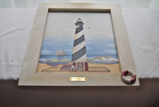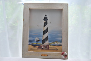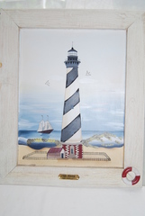 BRAND NEW BEAUTIFUL CAPE HATTERAS LIGHTHOUSE SCENE 1873 FRAMED PAINTING IN A WHITE WASHED WOODEN FRAME WITH INSET LIFE PRESERVER ACCENT. MEASURES: 16" HIGH x 13" WIDE x 1" THICK, INCLUDES FREE SHIPPING