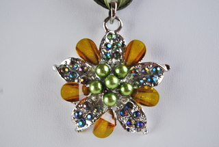 Ladies Designer Green, Gold & Crystal Floral Design Necklace on Ribbon Cord
