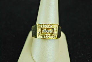 Men's Designer 18k Overlay Gold Ring with 3 Zirconium center stones with rectangular rope design face. Size 12.