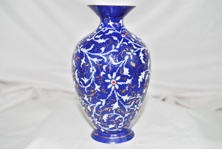 Cloisonne Metal Vase, Royal Blue with Hand-Painted Floral Design with 24K Gold Inlay Accents, Collectible. 5" H x 3" W.