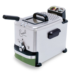 Emeril Deep Fryer, 3.5 Quart Deep Fryer. Holds up to 2.65 pounds of food, digital timer. Immersion heating element to maintain the perfect temperature fry after fry. Automatically filters and drains the used oil into the integrated storage container. Integrated oil container collects the cleaned oil and stores it for reuse.