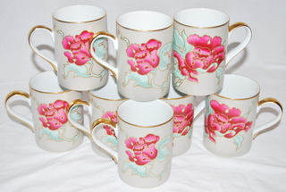 Fitz & Floyd Vintage Fine China Porcelain Mugs. Deauville Peony Design, 24K Gold Trim. Set of 8.