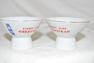 Gekkeikan Matchin Pair of 24K Gold Trimmed Saki Cups, White Porcelain with Blue Oriental Accents.