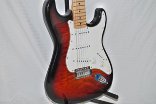New Gitano Strat Style Solid Alder Body 6-String Right Hand Electric Guitar. Maple 22 Fret Fingerboard, High Gloss Finish, Quilt Maple Top, Chrome Head, 3 Humbucker Pick-Ups, Volume, 2 Tone and 5 Way Lever Switching, Whammy Bar and White Pick Guard.