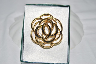 Ladies Designer Brooch, Gold Plated with Swirl Half-Moon / Flower Design, 3 Inch Diameter.