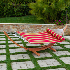 Outdoor 14-ft Olefin Hammock with Stand. Set includes an attractive, mufti-ply Cypress wood hammock stand and oversize 2-person quilted red striped Olefin polyester hammock bed. Includes 48" Olefin polyester all-weather bolster pillow. The wood frame forms a beautiful crescent arc, easy to assemble using the the hardware included in the package. Total assembly time approximately 20 minutes. Cypress wood spreader bars separate the cotton rope. Hammock is secured by strong 12" Stainless chains and hooks that attach to the frame.