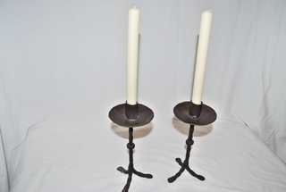 Two "Hand Forged" Wrought Iron Candlestick Holders with Candles. 9"H x 4"W.