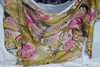 Nordstrom Designers Scarf, Peacock Feather Design of Yellow, Pink, White and Brown. 100% Polished Cotton. 78" x 24".