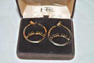 Ladies Designer 2" Pierced Gold Hoops Earrings, 12K Gold Filled with Latice Scroll Design, new in original box.