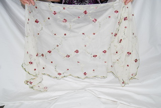 Lace Scarf of Cream, Burgandy, Green & Pink. Flower Design with Scalloped Edged Design. 100% Polyester. 15" W x 56" L.