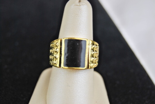 Men's Designer 18k Gold Overlay Ring with Onyx Lacquer in an Etched Band Design. Size 12.