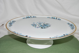Limoges 24K Gold Trimmed Cake Stand, White with Blue Floral design and 24K Gold Accented Rim. Made in France by Tharaud.