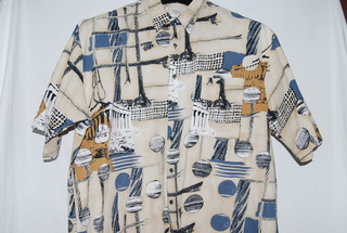 Expressions 2XL Designer casual mens short sleeve shirt, front button pocket, 100% Cotton, Beige Euro pattern, new without tags.