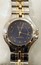 This majestic Geneva men's, gold, quartz precision watch has a enchanting dark blue face, alluring bezel and a exquisite bracelet style, gold link band.