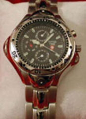 Men's Swiss Time Designer Quartz Watch with silver and black face, bold bezel and bracelet style band.