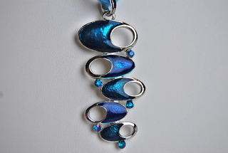Ladies Designer Metallic Blue Cloisanne Geometric Design Necklace on Blue Ribbon Rope Cord.