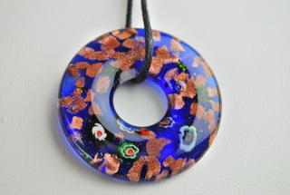 Ladies Murano Hand-Blown Glass in Circular Blue & Gold Metallic Design Pendant Necklace on 18" Rope Cord.