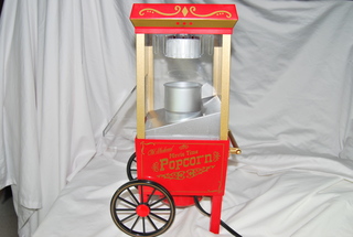 Collectable Old Fashion Movie Time Popcorn Machine with Wheeled Base, Red & Gold Trim. 110v. Open Box, Tested.