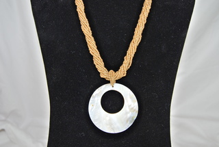 Ladies Designer White Circular Penchant in Natural Sea Shell with Gold Beads Necklace, Adjustible Lobster Clasp, Twist Beads for Different Design Effects.