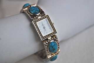 Ladies Designer Quartz Watch with Silver Inlay & Turquoise Stones.