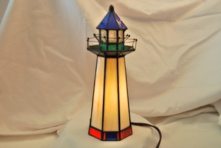 Stained Glass Lighthouse Lamp with Blue Roof. 12" H. 110V.