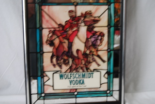 Beautiful Stained Glass Wall Clock, Wolfschmidt Vodka, Roman Numerals with Stained Glass Knight on Horseback Charging, Mirrored Edges, 36" Tall, 30" Wide.