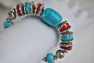 Ladies Designer 8 1/2" Rhomblic Design, Turquoise & Silver Bracelet with Toggle Clasp.