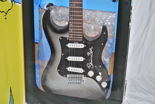 New Weezer, Brian Bell Autographed Washburn-Lyons Electric Guitar with COA, Metallic Silver Solid Hardwood Body with Black Pickguard, 3 Humbucker Pick-Ups, 3 Way Switch, Nickel Silver Frets, Volume & Tone Knobs, 6-String, Right Hand, 22 Fret Rosewood Fingerboard, Whammy Bar, Strap and Picks.